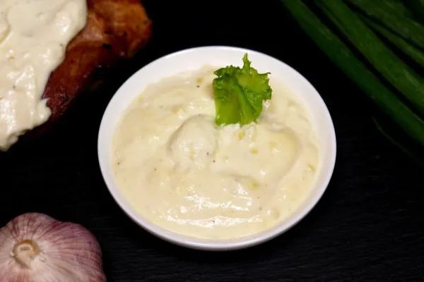- Сметана должна быть жирной. 20% — минимум, идеально — деревенская или фермерская. Она не свернётся от чеснока и даст нужную текстуру.