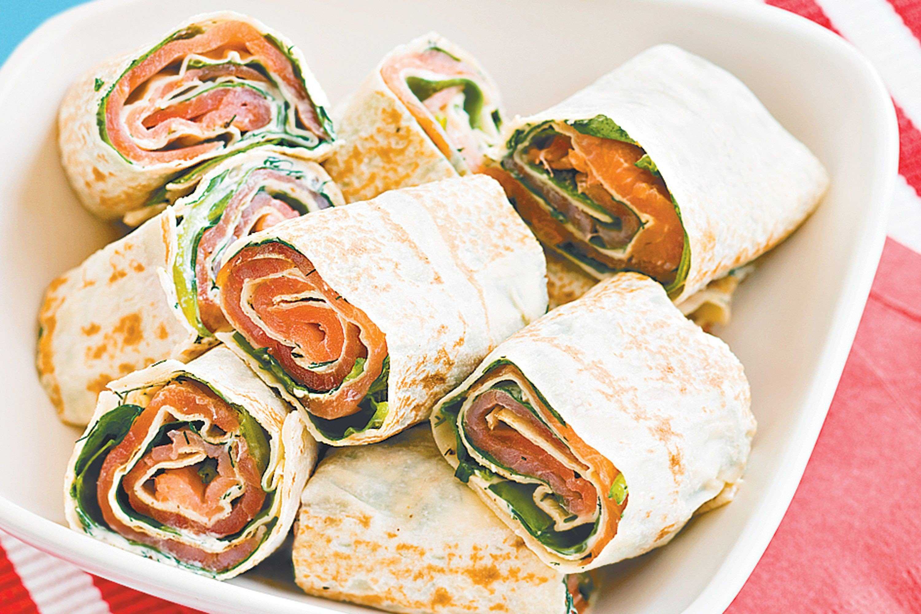 - Выложить начинку на лаваш, свернуть рулетом