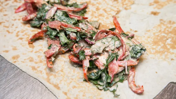 - На лаваш выложите мясо, сверху — горсть кинзы. Заверните конвертом.